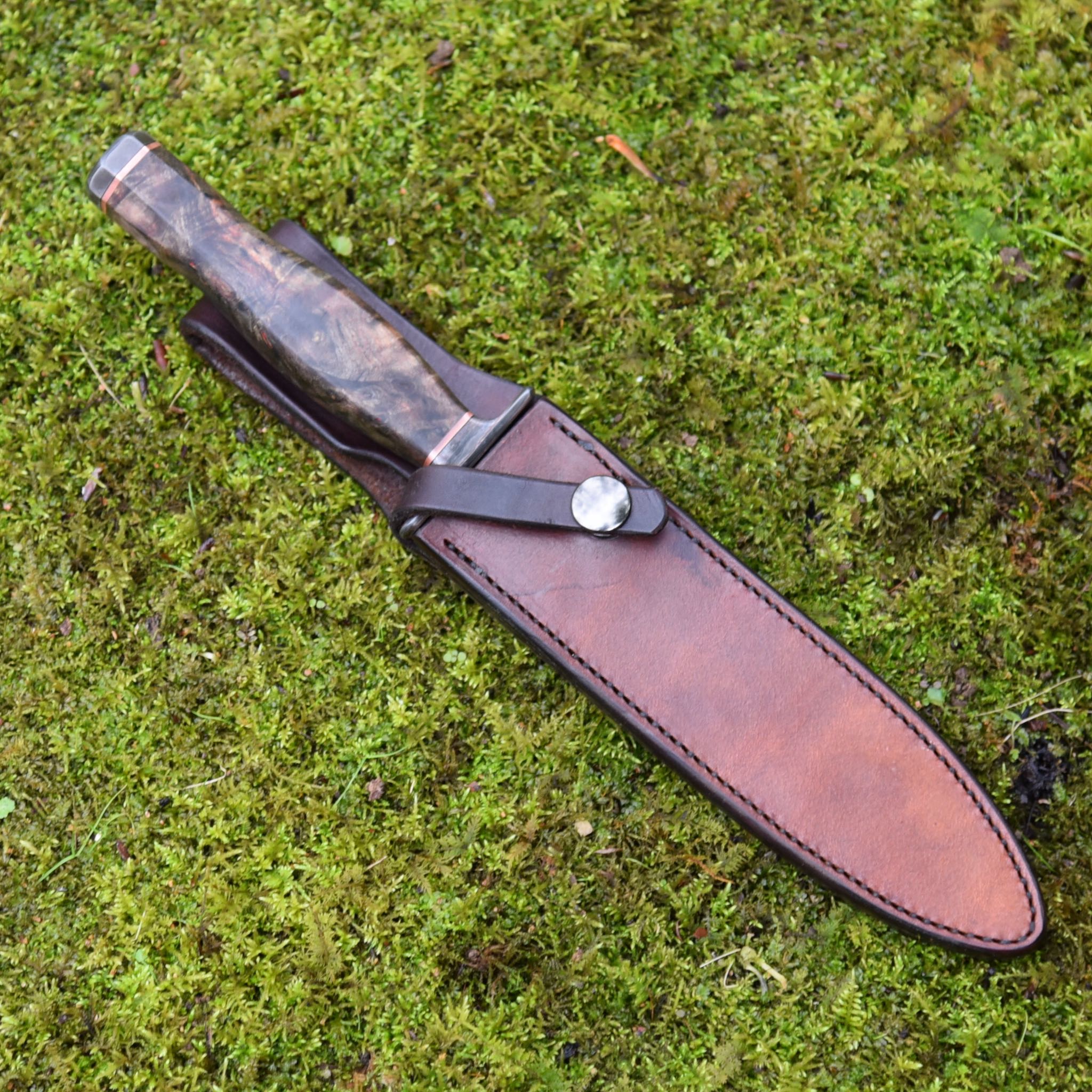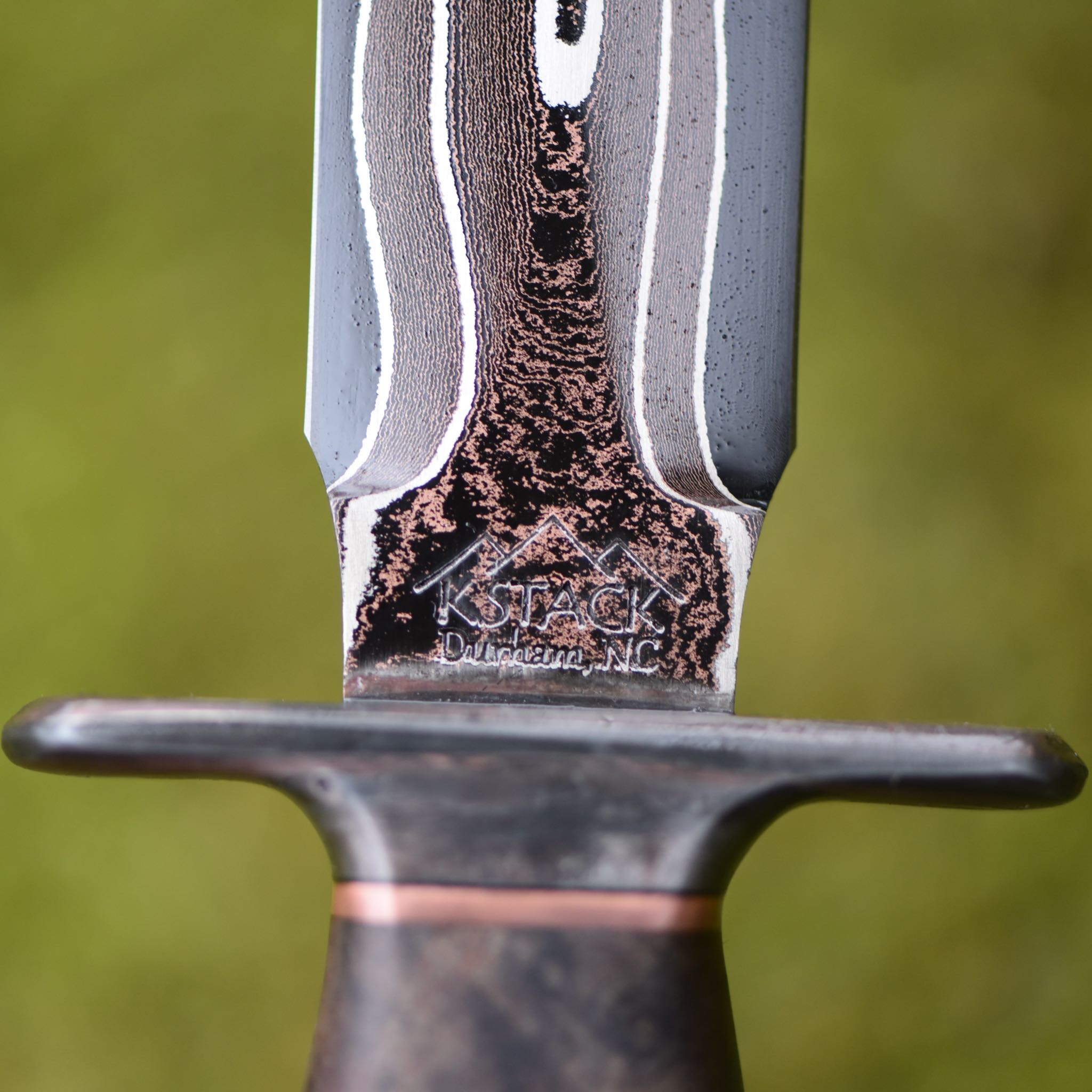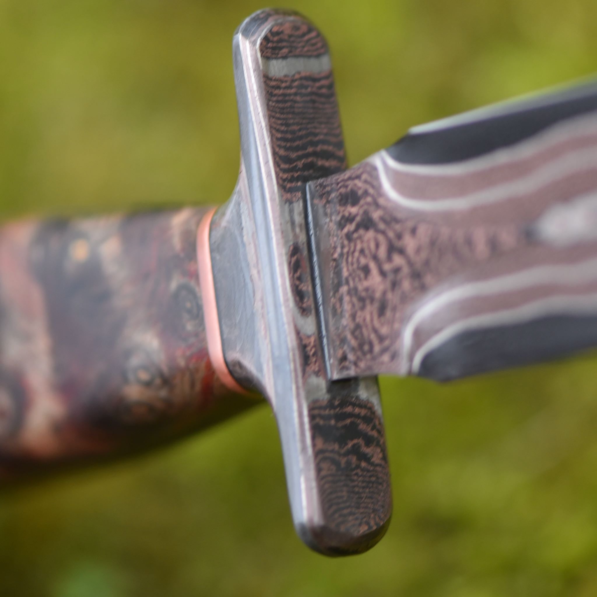 Light dagger with dyed box elder burl handle. Baker Forge Tsunami (Cu/Ni) blade. Coppermascus cladding over 80CRV2 core with nickel shims.
