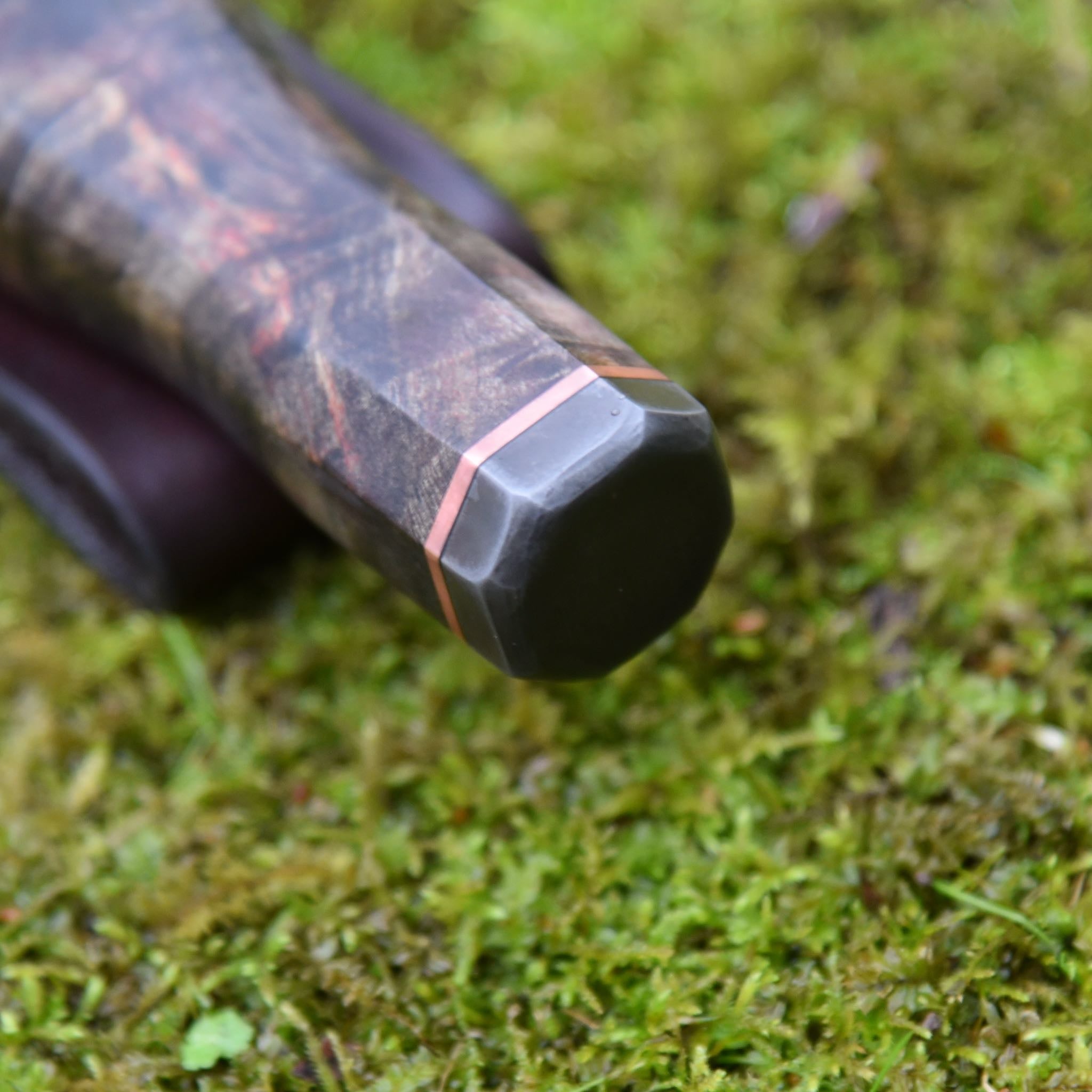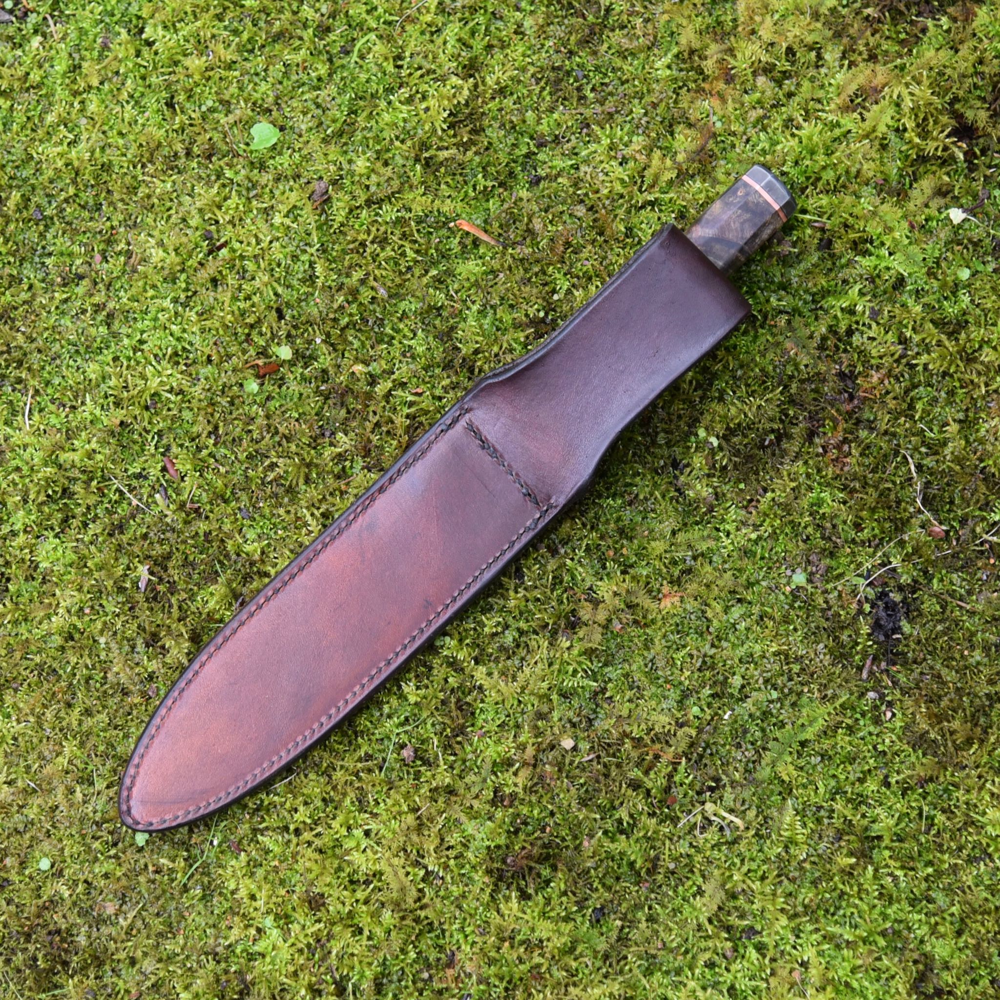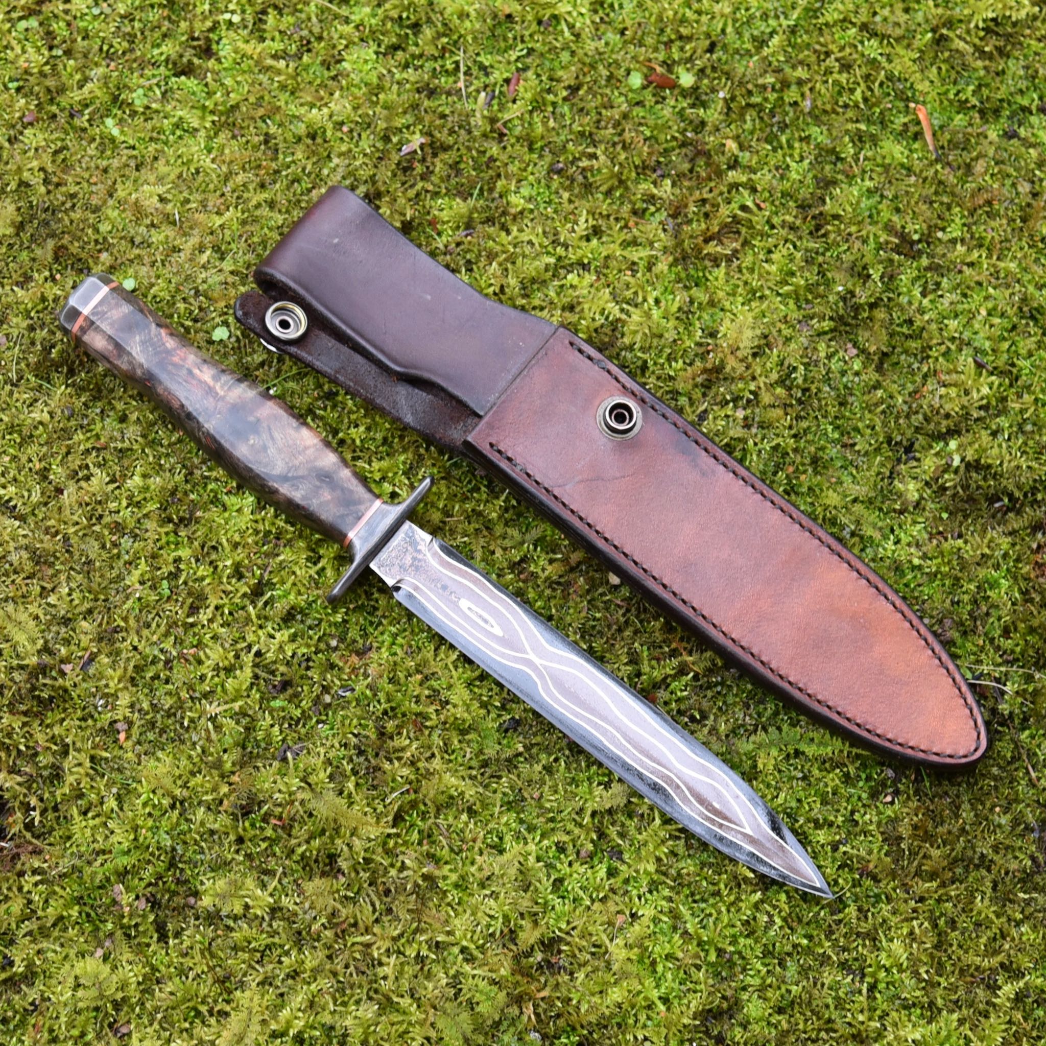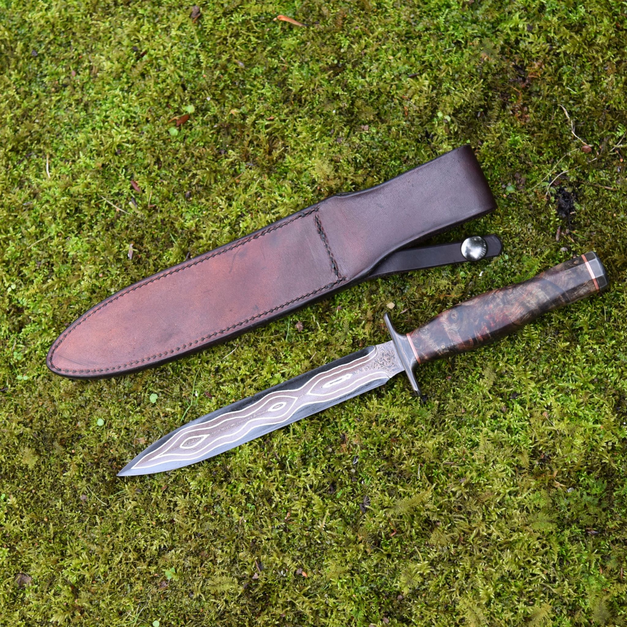 Light dagger with dyed box elder burl handle. Baker Forge Tsunami (Cu/Ni) blade. Coppermascus cladding over 80CRV2 core with nickel shims.